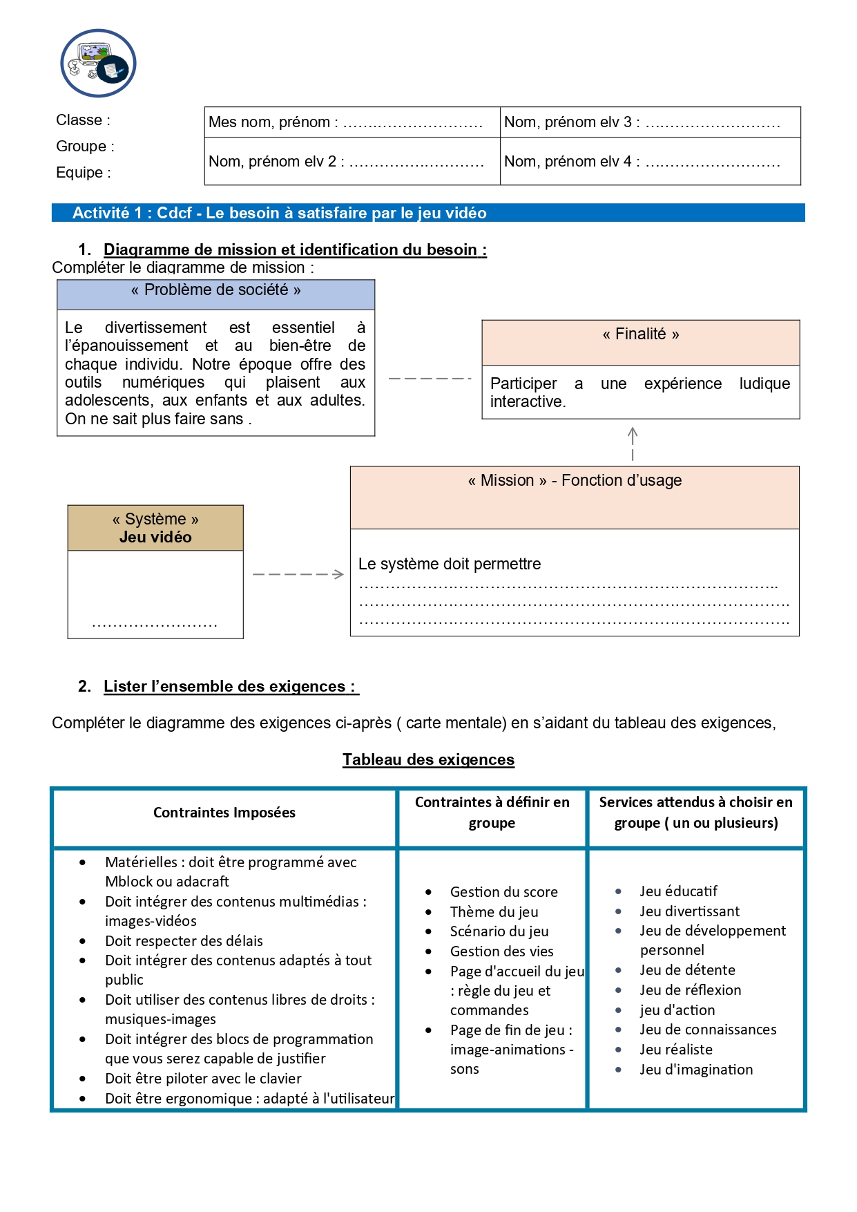 De l'identification du besoin au cahier des charges.Afin de rédiger le cahier des charges du jeu vidéo, il est nécessaire de considérer des Informations importantes à retenir :